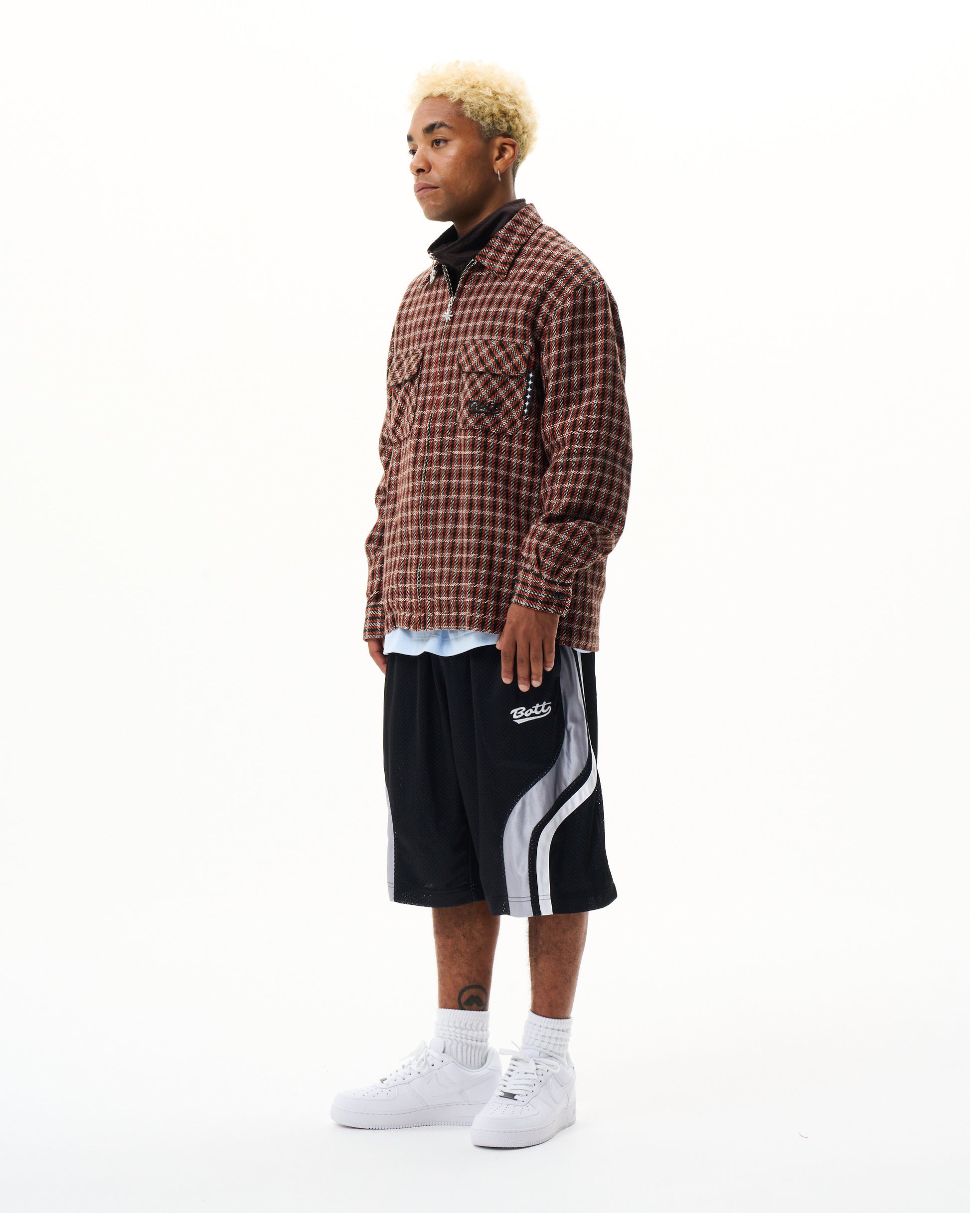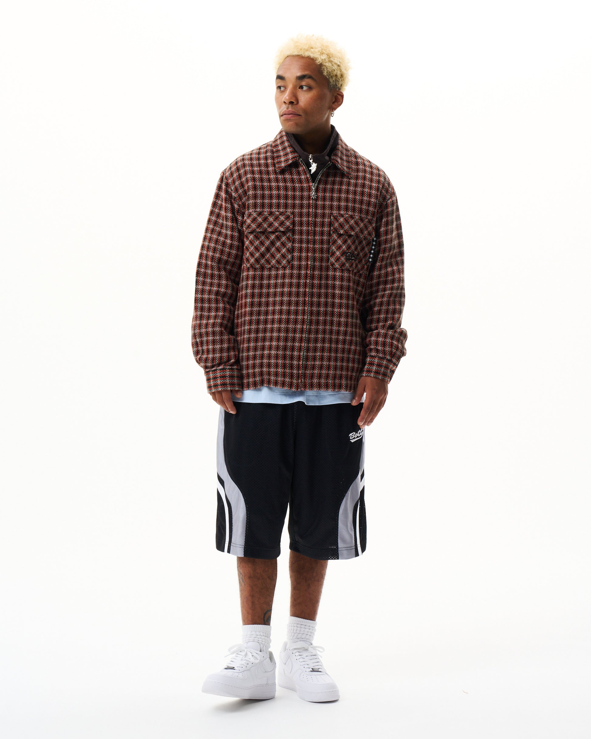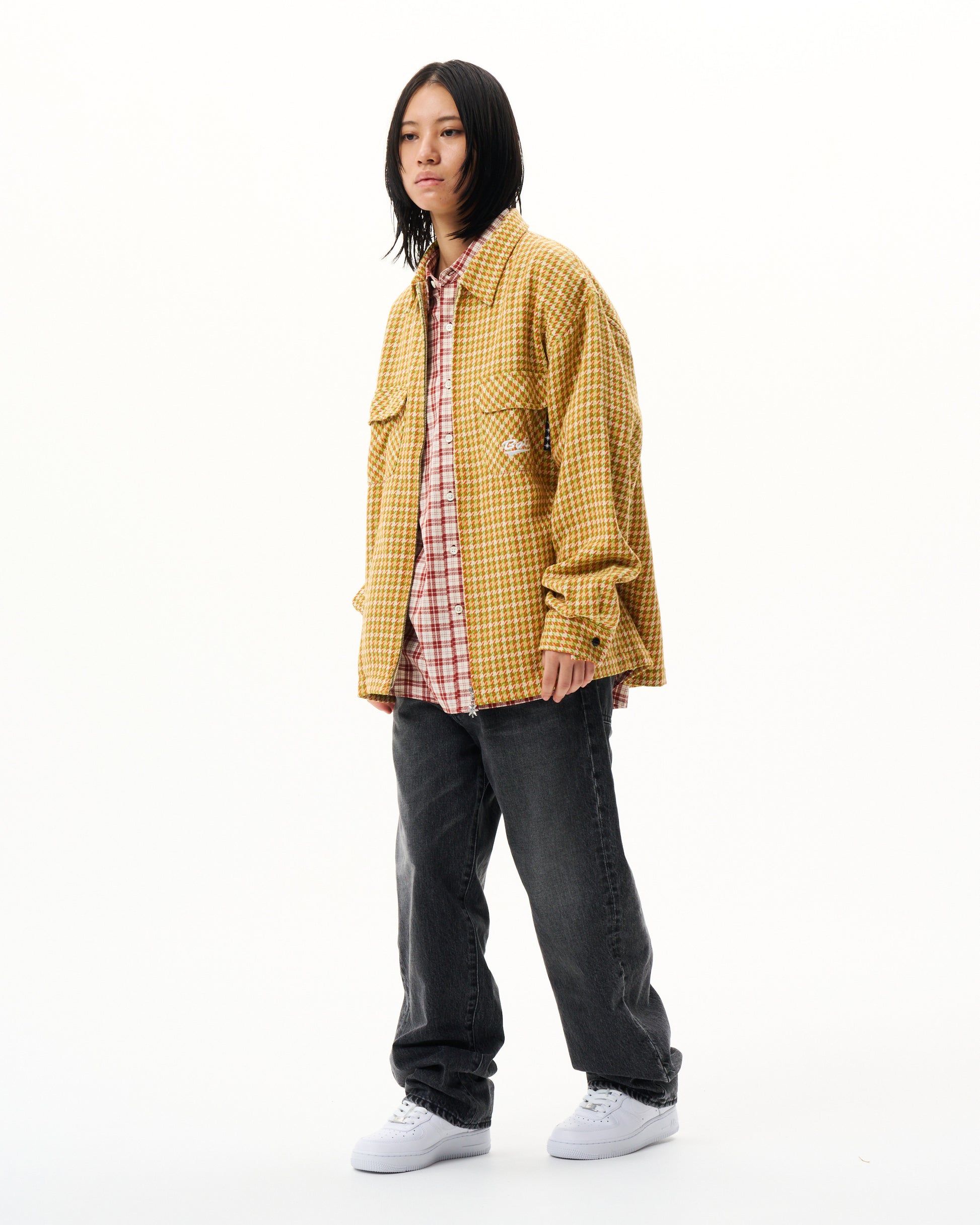 Zip-up up shirt made from heavyweight woven check fabric